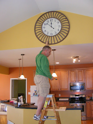 It was a hanging things day.  We hung the clock first, which went up so well, without any cussing or throwing things, that I just knew everything else would be difficult.  But everything went up just that easy.  Not luck, good husband choosing skills, I think.  He even hung a curtain rod for me. Everything looks so good.  It feels nice to be hanging things and really be moved in and staying.  You can see that I am painting the trim brown, which I may never be finished with. But , it looks so good.  We are going to pull the carpet out of the living room and put hardwood flooring down during the week of spring break, April 14th.  Keep our knees and fingers in your prayers.